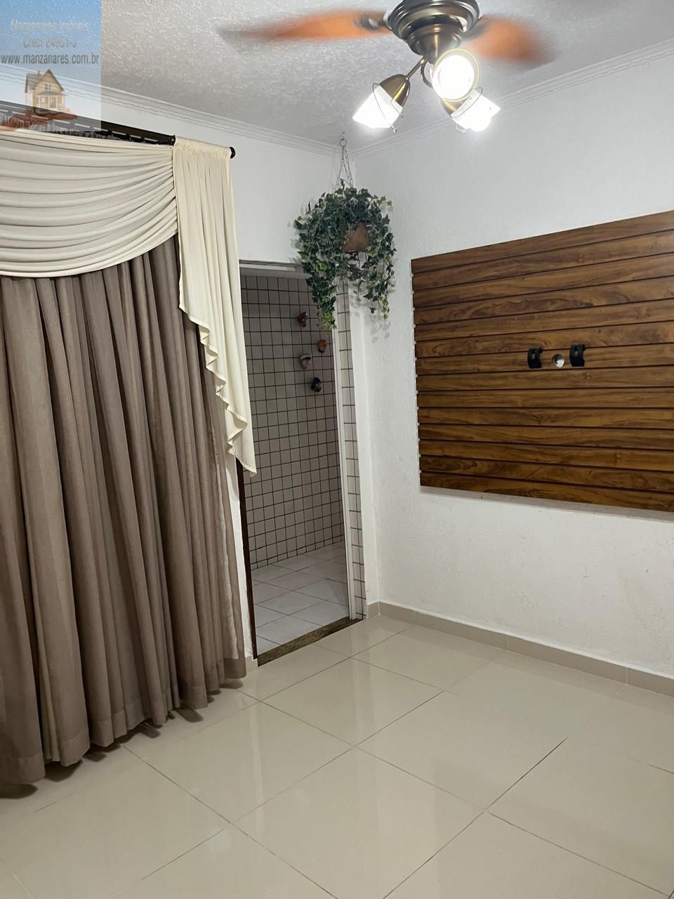de teto e cortinas na janela. No banheiro principal possui um box em vidro e armários. Na suíte,